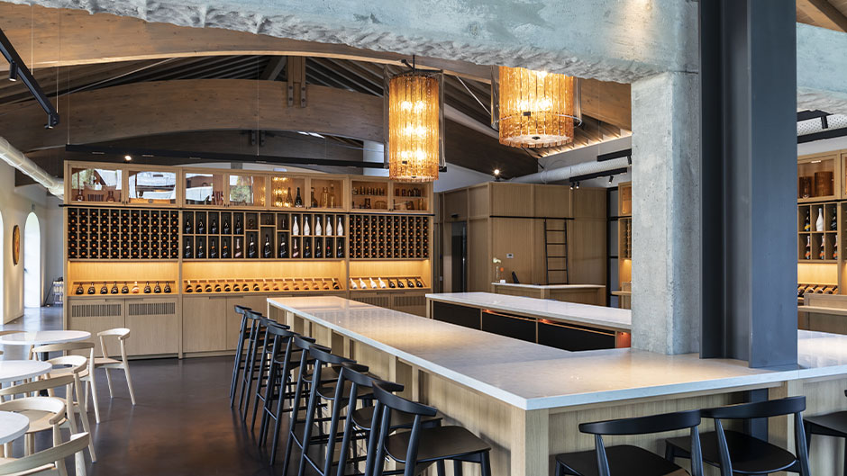 館内には、くつろぎのリビングスペース、洗練されたワインショップ&ワインバー、会議室やテイスティングルームがあり、屋外には周囲の丘を一望できるテラスも備えています。ビジターセンター発のガイドツアーでは、総面積15,000㎡にも及ぶ醸造施設をご見学いただけ、地下最大15mにおよぶダイナミックな構造を間近に体感していただけます。